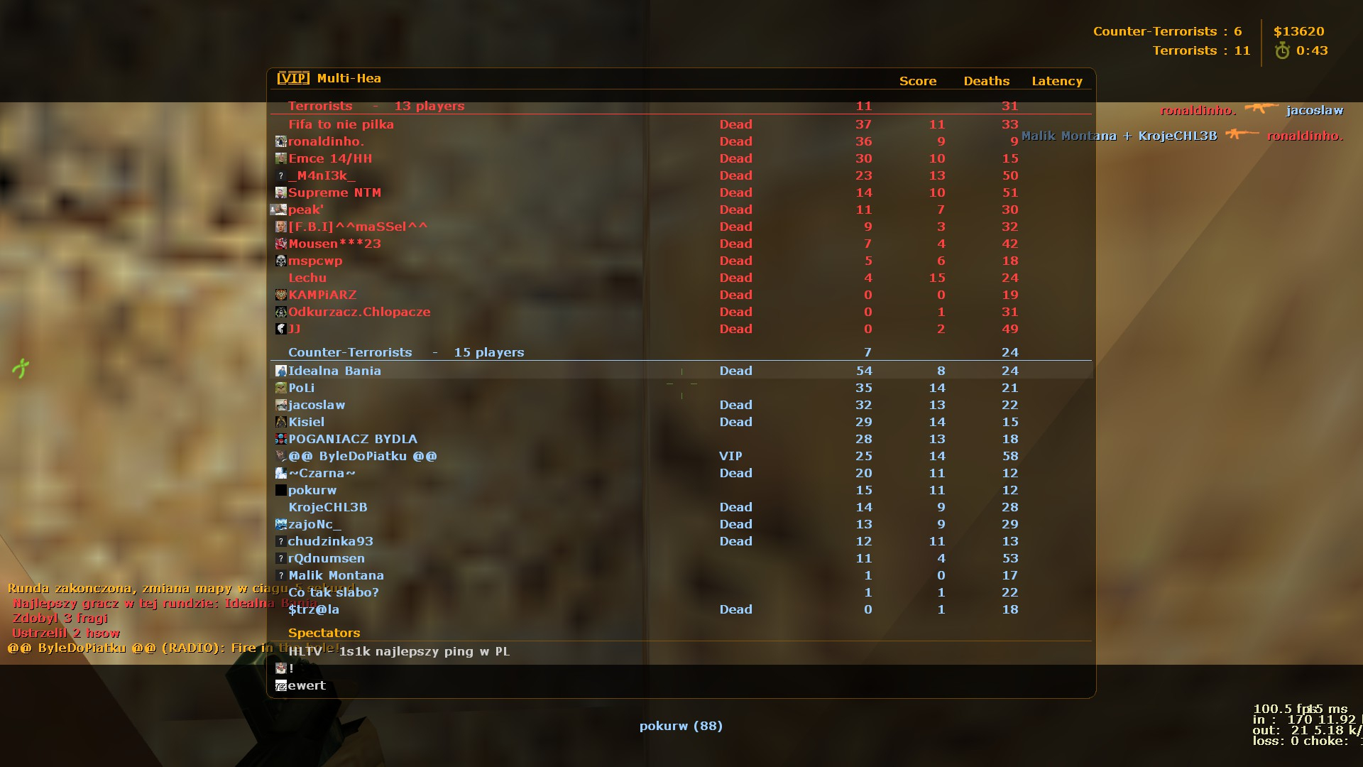 Konkurs na gracza miesiąca! Najwięcej fragów na mapie. Czas trwania: 01.01.2019 - 01.02.2019. Zabawa polega na zdobyciu jak największej ilości fragów na serwerze. Wszystkich gorąco zachęcam do udziału w konkursie. Pierwsze 3 osoby zostaną nagrodzone. Regulamin: Konkurs trwa na serwerach: ODD2, DD2/INF, FFA, CS:GO MOD #1-4. Screeny najlepszego wyniku proszę wstawiać od razu do podglądu oraz pod tym postem innych nie uznaję. Próby oszustwa będą karane. Udział w konkursie dla każdego gracza! Wzór: Nick: Serwer: Data: Screen: Nagrody: 1. Vip na 2 miesiące lub Svip 1 na miesiąc na dowolnym serwerze + ranga na forum i ts ‘Gracz miesiąca’ 2. Vip na 2 miesiące na dowolnym serwerze. 3. Vip na 1 miesiąc na dowolnym serwerze.2 punkty -