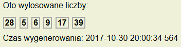 Przed podaniem swoich liczb zapoznaj się z REGULAMINEM! 1. Typujemy 6 liczb z zakresu 1-42 2. Jedna osoba może typować tylko raz w danej odsłonie. 3. Typy należy zgłaszać w postaci posta z wytypowanymi przez was liczbami np. 1,2,3,4,5,6. 4. Nie można zmienić swoich typów ani edytować po napisaniu posta! 5. Losowanie odbywać się będzie zawsze co 3 dni. 6. Aby wziąć udział potrzeba mieć minimum 15 postów (Nie dotyczy rangi Premium). Swoje liczby podajemy do 30.10.2017 do godz 20:00 Zapraszam do zabawy!