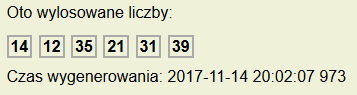 Przed podaniem swoich liczb zapoznaj się z REGULAMINEM! 1. Typujemy 6 liczb z zakresu 1-42 2. Jedna osoba może typować tylko raz w danej odsłonie. 3. Typy należy zgłaszać w postaci posta z wytypowanymi przez was liczbami np. 1,2,3,4,5,6. 4. Nie można zmienić swoich typów ani edytować po napisaniu posta! 5. Losowanie odbywać się będzie zawsze co 3 dni. 6. Aby wziąć udział potrzeba mieć minimum 15 postów (Nie dotyczy rangi Premium). Swoje liczby podajemy do 14.11.2017 do godz 20:00 Zapraszam do zabawy!