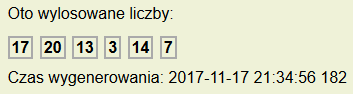 Przed podaniem swoich liczb zapoznaj się z REGULAMINEM! 1. Typujemy 6 liczb z zakresu 1-42 2. Jedna osoba może typować tylko raz w danej odsłonie. 3. Typy należy zgłaszać w postaci posta z wytypowanymi przez was liczbami np. 1,2,3,4,5,6. 4. Nie można zmienić swoich typów ani edytować po napisaniu posta! 5. Losowanie odbywać się będzie zawsze co 3 dni. 6. Aby wziąć udział potrzeba mieć minimum 15 postów (Nie dotyczy rangi Premium). Swoje liczby podajemy do 17.11.2017 do godz 20:00 Zapraszam do zabawy!