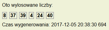 Przed podaniem swoich liczb zapoznaj się z REGULAMINEM! 1. Typujemy 6 liczb z zakresu 1-42 2. Jedna osoba może typować tylko raz w danej odsłonie. 3. Typy należy zgłaszać w postaci posta z wytypowanymi przez was liczbami np. 1,2,3,4,5,6. 4. Nie można zmienić swoich typów ani edytować po napisaniu posta! 5. Losowanie odbywać się będzie zawsze co 3 dni. 6. Aby wziąć udział potrzeba mieć minimum 15 postów (Nie dotyczy rangi Premium). Swoje liczby podajemy do 05.12.2017 do godz 20:00 Zapraszam do zabawy!
