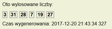 Przed podaniem swoich liczb zapoznaj się z REGULAMINEM! 1. Typujemy 6 liczb z zakresu 1-42 2. Jedna osoba może typować tylko raz w danej odsłonie. 3. Typy należy zgłaszać w postaci posta z wytypowanymi przez was liczbami np. 1,2,3,4,5,6. 4. Nie można zmienić swoich typów ani edytować po napisaniu posta! 5. Losowanie odbywać się będzie zawsze co 3 dni. 6. Aby wziąć udział potrzeba mieć minimum 15 postów (Nie dotyczy rangi Premium). Swoje liczby podajemy do 20.12.2017 do godz 20:00 Zapraszam do zabawy!
