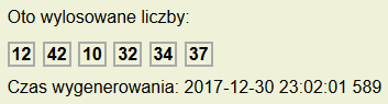 Przed podaniem swoich liczb zapoznaj się z REGULAMINEM! 1. Typujemy 6 liczb z zakresu 1-42 2. Jedna osoba może typować tylko raz w danej odsłonie. 3. Typy należy zgłaszać w postaci posta z wytypowanymi przez was liczbami np. 1,2,3,4,5,6. 4. Nie można zmienić swoich typów ani edytować po napisaniu posta! 5. Losowanie odbywać się będzie zawsze co 3 dni. 6. Aby wziąć udział potrzeba mieć minimum 15 postów (Nie dotyczy rangi Premium). Swoje liczby podajemy do 29.12.2017 do godz 20:00 Zapraszam do zabawy!