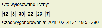 Przed podaniem swoich liczb zapoznaj się z REGULAMINEM! 1. Typujemy 6 liczb z zakresu 1-42 2. Jedna osoba może typować tylko raz w danej odsłonie. 3. Typy należy zgłaszać w postaci posta z wytypowanymi przez was liczbami np. 1,2,3,4,5,6. 4. Nie można zmienić swoich typów ani edytować po napisaniu posta! 5. Losowanie odbywać się będzie zawsze co 3 dni. 6. Aby wziąć udział potrzeba mieć minimum 15 postów (Nie dotyczy rangi Premium). Swoje liczby podajemy do 28.02.2018 do godz 20:00 Zapraszam do zabawy!