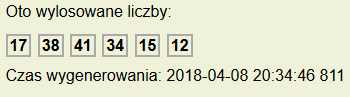 Przed podaniem swoich liczb zapoznaj się z REGULAMINEM! 1. Typujemy 6 liczb z zakresu 1-42 2. Jedna osoba może typować tylko raz w danej odsłonie. 3. Typy należy zgłaszać w postaci posta z wytypowanymi przez was liczbami np. 1,2,3,4,5,6. 4. Nie można zmienić swoich typów ani edytować po napisaniu posta! 5. Losowanie odbywać się będzie zawsze co 3 dni. 6. Aby wziąć udział potrzeba mieć minimum 15 postów (Nie dotyczy rangi Premium). Swoje liczby podajemy do 07.04.2018 do godz 20:00 Zapraszam do zabawy! Edytowane czwartek o 23:11 przez RYBSON