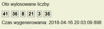 Przed podaniem swoich liczb zapoznaj się z REGULAMINEM! 1. Typujemy 6 liczb z zakresu 1-42 2. Jedna osoba może typować tylko raz w danej odsłonie. 3. Typy należy zgłaszać w postaci posta z wytypowanymi przez was liczbami np. 1,2,3,4,5,6. 4. Nie można zmienić swoich typów ani edytować po napisaniu posta! 5. Losowanie odbywać się będzie zawsze co 3 dni. 6. Aby wziąć udział potrzeba mieć minimum 15 postów (Nie dotyczy rangi Premium). Swoje liczby podajemy do 14.04.2018 do godz 20:00 Zapraszam do zabawy!
