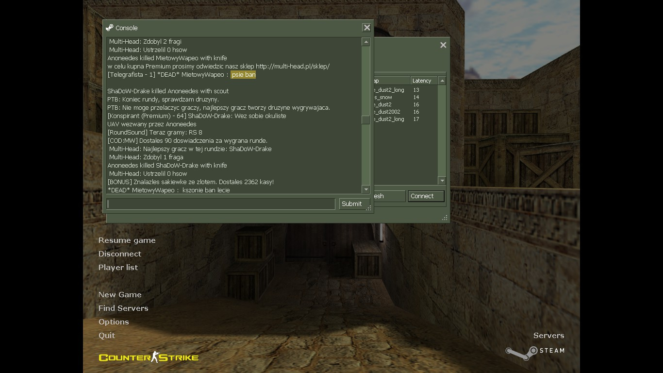 No siema z takim graczem to się jeszcze nie spotkałem nie wiem czy akurat tutaj powinienem rozwijać ten temat ale no bez kitu tak się nie pisze jedyne czego nie zabrałem tu na temat to ip tego gracza ale to już w logach możecie sprawdzić . A dodatku mówię graczowi na micro by się ogarną bo zaraz wyłapie bana to mnie cisnąć zaczął i wyszedł z serwera. Dla tego jest ten temat Nick : MietowyWapeo Mapa : de_dust2_long data : dzisiejsza 02,02,19 - między 2:15 a 2:21 Świadkowie są : Anoneedes Dowody też : screeny