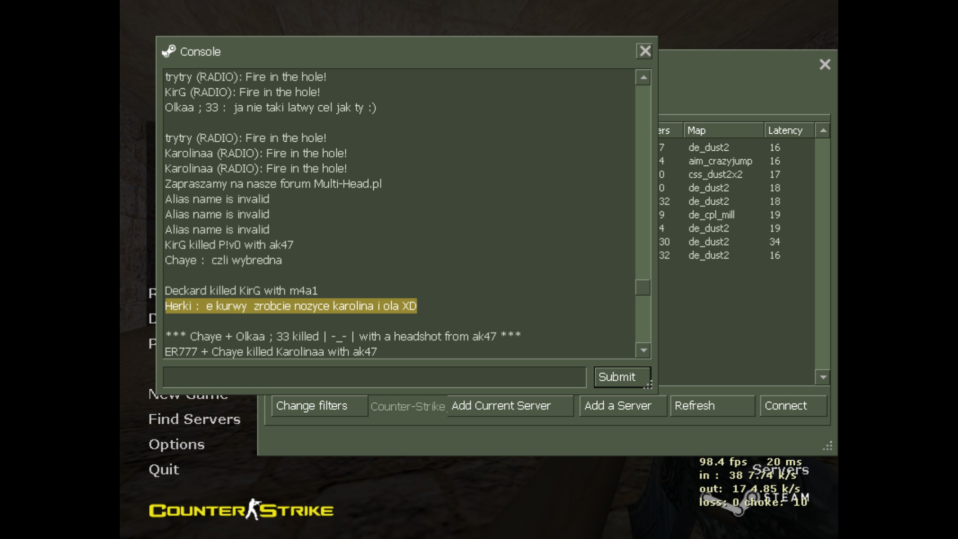 Nick na serwerze:aaa iheb Link do gt (gametracker):https://www.gametracker.com/player/aaa iheb/147.135.197.53:27015/ Twoje steam id: STEAM_1:0:1211561170