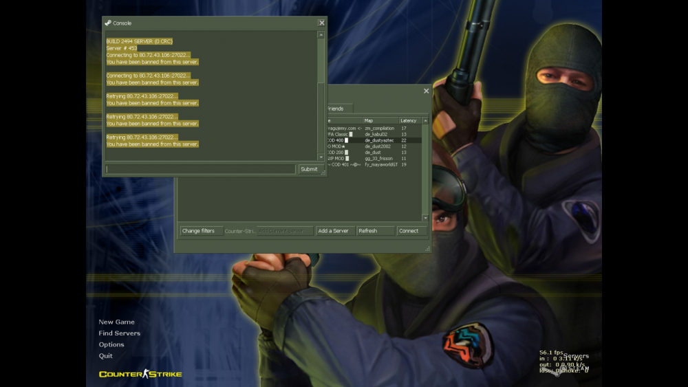 Siema , Mam problem z wejściem na serwer , grałem normalnie na mapie c4 , wiocha a po zmianie mapy nie mogę wejść , patrzyłem też inne serwery. Ale na nie mogę bez problemu wchodzić . Wpisywałem też przez konsole connect ip i też nie mogę wbić , wychodziłem z cs i wchodziłem na nowo i na dal to samo , steam jeszcze nie wyłączałem może coś by dało ale jak nie to piszę ten post ssy niże co to za problem , dobra restowałem steam i też nie pomogło nie wiem co jest 5 , czy mi jaką blokadę dali xD czy jak? ja wbić nie mogę ale gracze grają , Pytanie czy karę mi daliście na Serwer ? xDŻe co bana mam xD