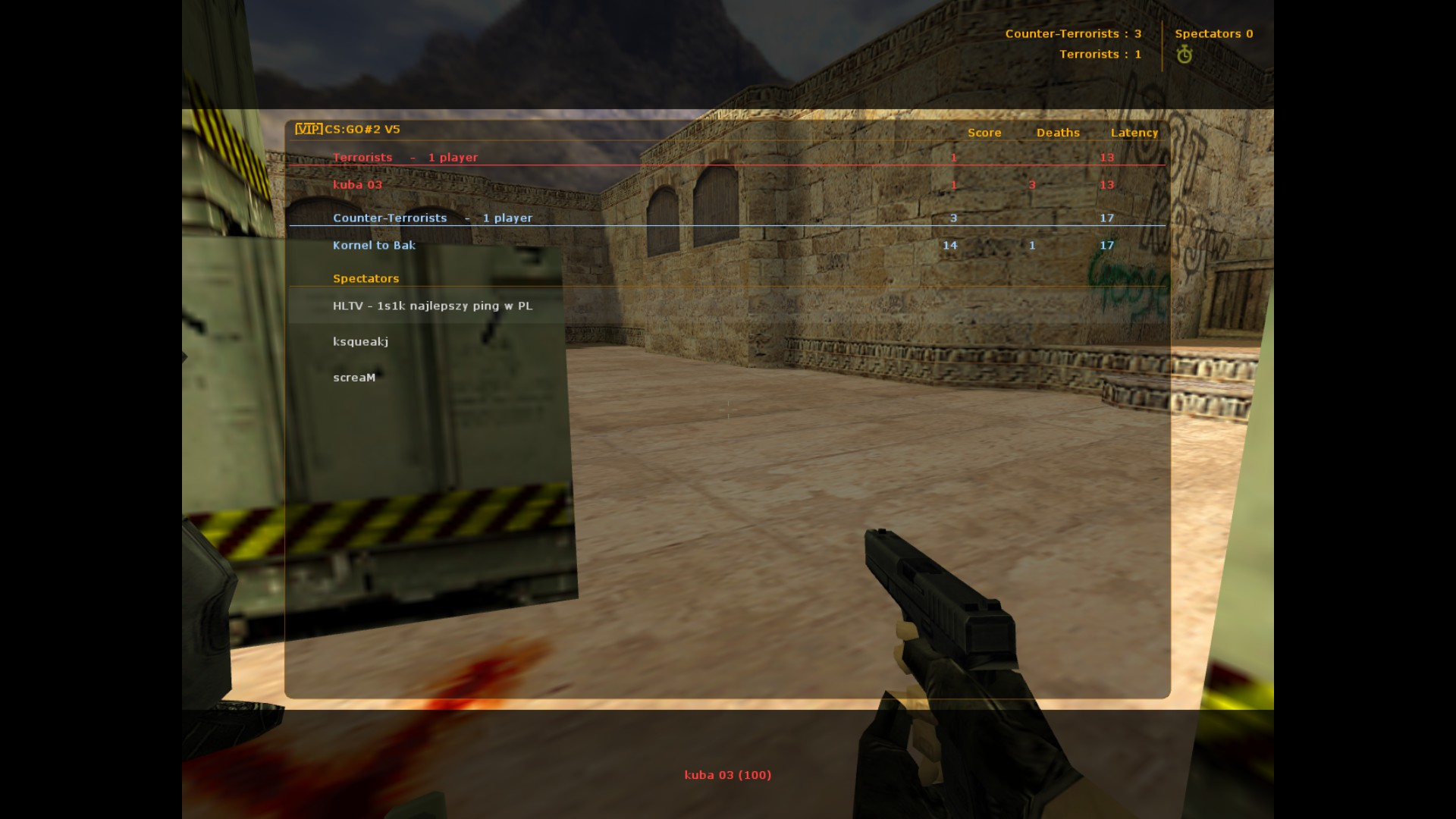Nick cheat'era: kuba 03 oraz Kornel to BakGodzina, data zdarzenia: wczorajMapa: dust2 oraz mirage2x2Serwer: go modLink do demka: zbędne. Screeny z demek w zupełności wystarczą.STEAM_ID/IP: brak(demka)Uzasadnienie: Na screenach wyraznie widać nabijanie misji przez tych panów. Dodatkowo brak kultury (notoryczny). Sugerowana kara to kuba 03 - ban 12h(nabijanie misji). Kornel to Bak - ban 24h (nabijanie misji,notoryczny brak kultury) Wracając do gracza Timcio (zgłosił go wczoraj LuckyLoser). Przeszukałem dokładnie 7 demek z okresu wczorajszego tj. z godzin 10:00-12:00. Z czego gracz znajdował się, aż na 4 demkach? Wszystkie akcje były czyste (typowe zachowanie początkującego - celownik skierowany w ziemię i nawet nie wyrabiał wystrzelić, bo zaliczał "glebę". Także wszystko na -b). Najwyraźniej zrobili sobie głupie żarty z ciebie Lucky :P. Na następny raz będziesz wiedział Tych dwóch Panów wychwyciłem podczas szukania "Timcia". Oddaję ich w wasze ręce, gdyż obecnie nie ma ich na serwerze