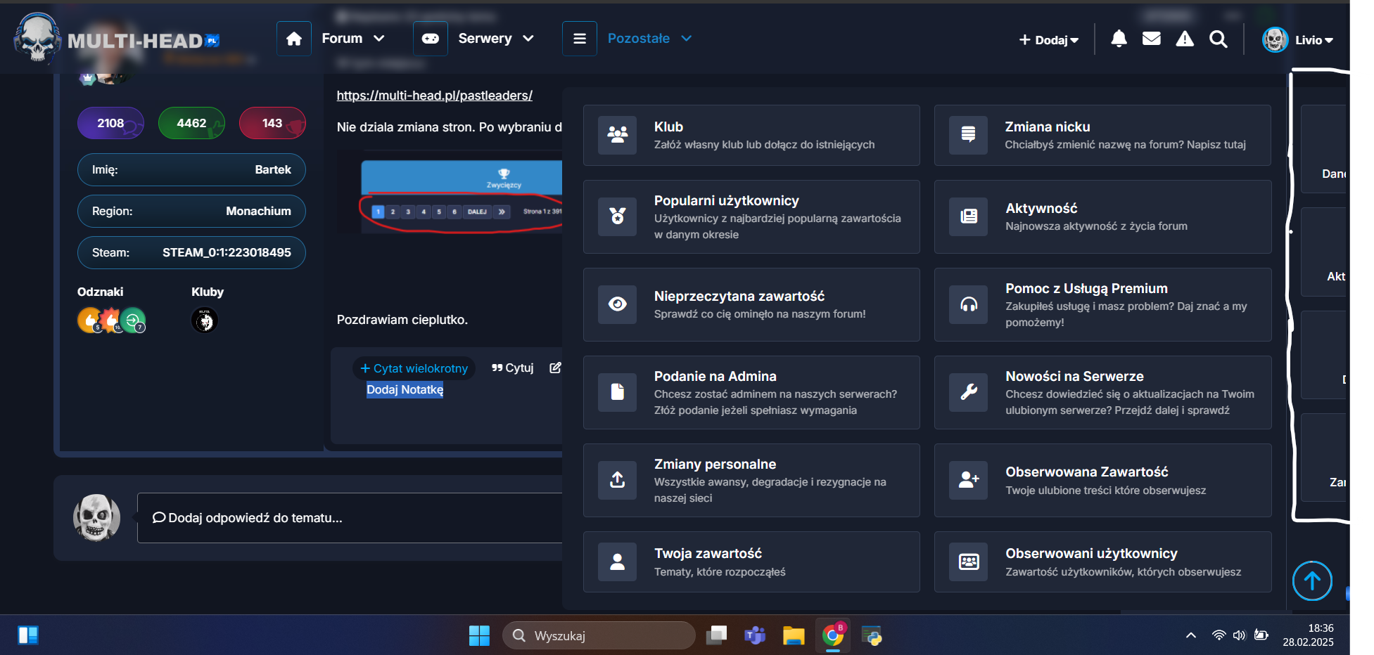 strafelegit Napisano 21 Sierpnia 2024 Udostępnij Napisano 21 Sierpnia 2024 (edytowane) Nie wiem, czy tak ma być na starym forum nie było, gdy jesteśmy na swoim/kogoś profilu i zjeżdżamy na dół to te statystyki po lewej stronie dzwinie się przemieszczają nie przetłumaczone Złe odnośniki W różnych częściach forum np w tym dziale nie widać pełnych nazw na starym stylu było widać pełne (Można to na spokojnie powiększyć jak na starym po prawej stronie mamy dużo miejsca do końca tej ściany) I ogólnie to sigma styl 💥 Edytowane 21 Sierpnia 2024 przez strafelegit aquax dodał reakcję 1 Cytuj Odnośnik do komentarza Udostępnij na innych stronach More sharing options...
