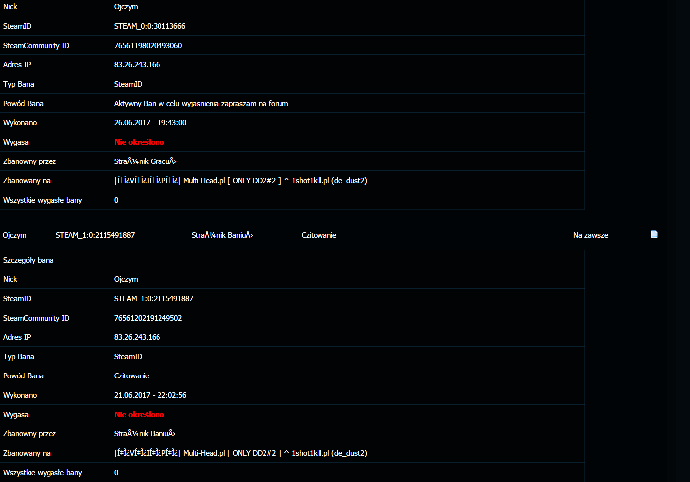 Ojczym Napisano 26 Czerwca 2017 Udostępnij Napisano 26 Czerwca 2017 Nick: Ojczym godzina, data zdarzenia: 19:45, 26/06/17 mapa: de_dust2 [AMXBans] =============================================== [AMXBans] You are permanently banned. [AMXBans] Banned Nickname : Ojczym [AMXBans] Reason : ' Aktywny Ban w celu wyjasnienia zapraszam na forum ' [AMXBans] You can complain about your ban @ www.Multi-Head.pl [AMXBans] Your SteamID : ' STEAM_0 : 0 : 30113666 ' [AMXBans] Your IP : ' 83.26.243.166 ' Odnośnik do komentarza Udostępnij na innych stronach More sharing options...